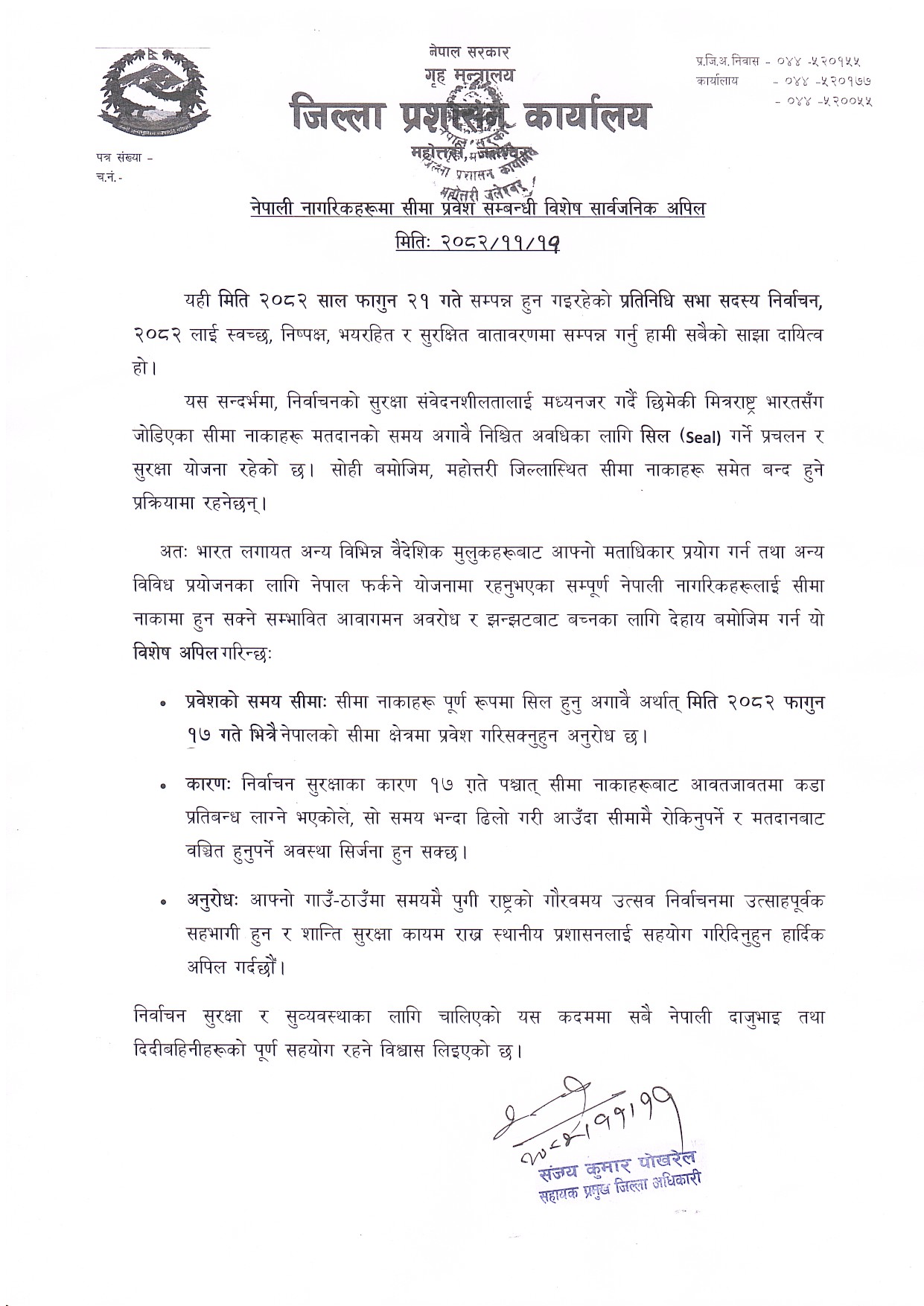 नेपाली नागरिकहरुमा सीमा प्रवेश सम्बन्धी विषेश सार्वजनिक अपिल